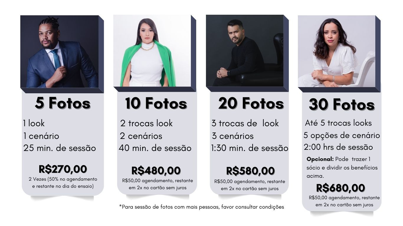 Para sessão de fotos corporativa acima de 3 pessoas trabalhamos com outras opções de pacotes.